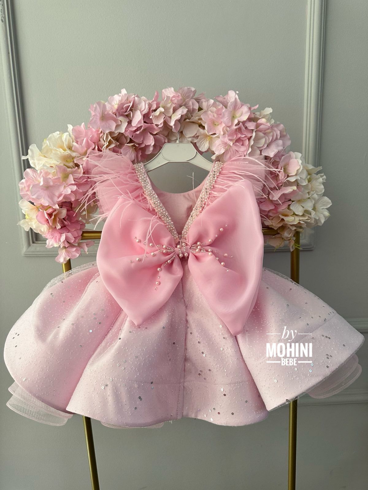 Vestido niña rosa pastel con plumas y brillos – vestido de princesa para comunión, boda o cumpleaños – hecho a medida y tallas en stock